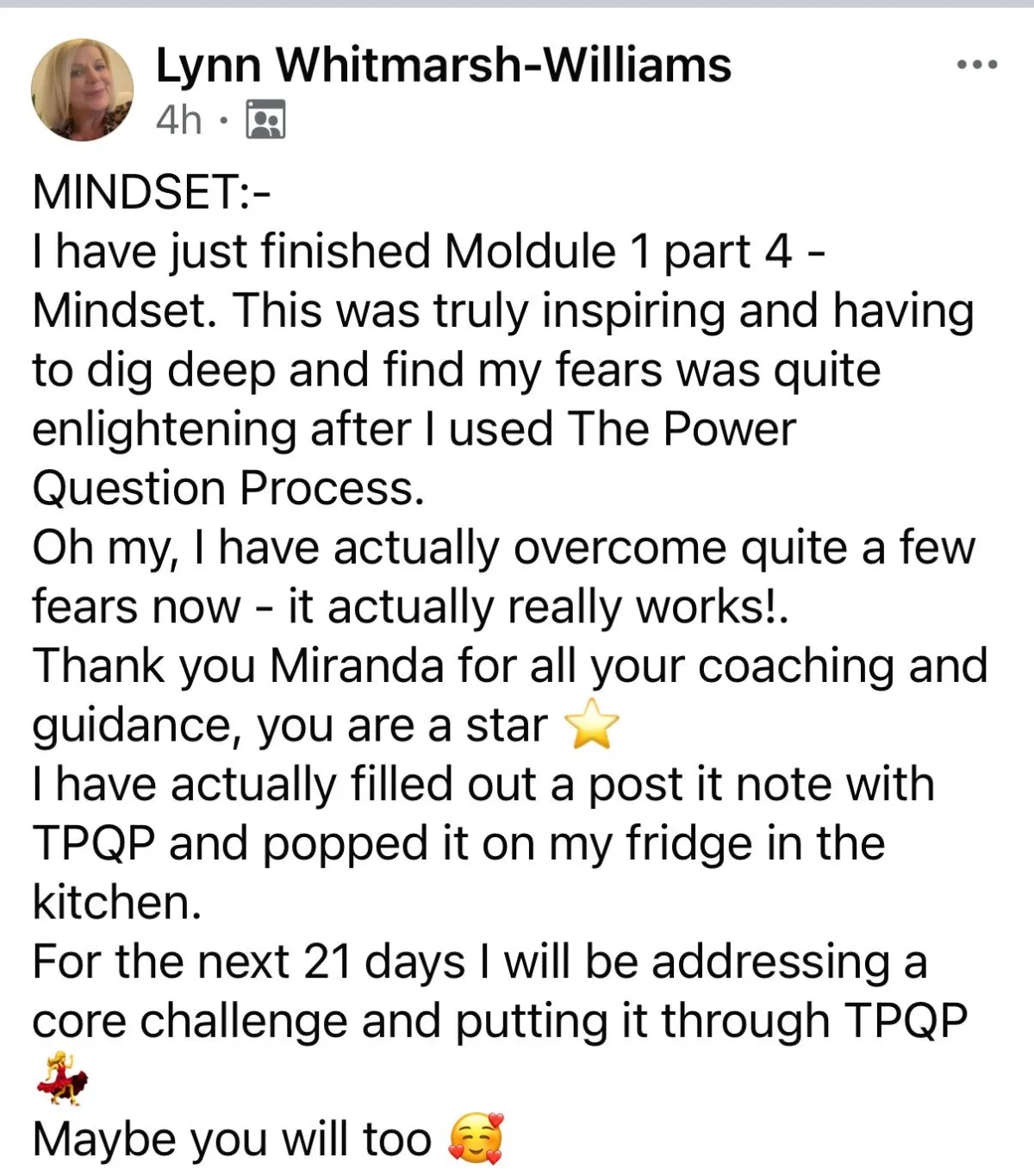 The training takes place over 12 weeks, and you will have unlimited contact and support within the group. Plus 2 extra weeks of support in the group. Miranda will be there every day to answer your questions and congratulate you on your progress!