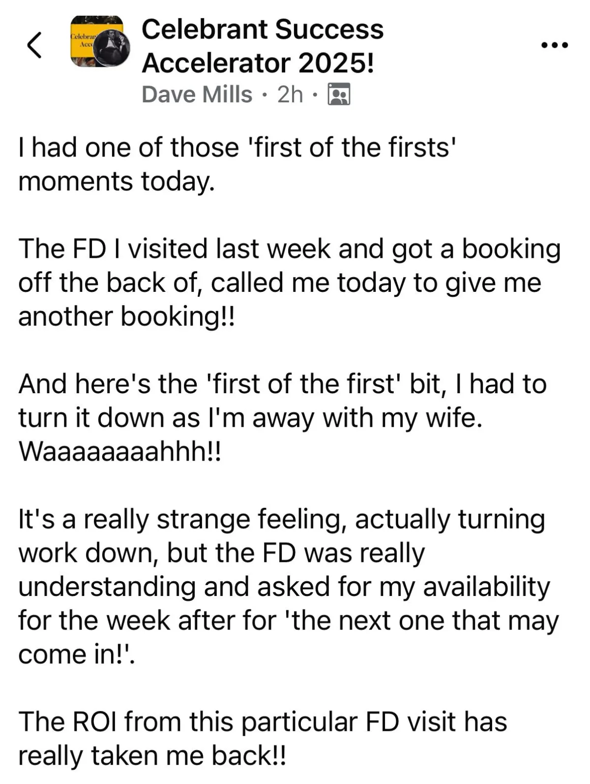 Over twelve weeks, the course transformed my approach—giving me confidence in marketing, a clearer strategy, and the tools to grow instead of just reacting. Since then, I’ve secured two weddings for 2026, conducted four funerals during the programme, and already seen a full return on my investment. Most importantly, I now feel confident about my business and its future, with the structure and community support to keep building momentum.