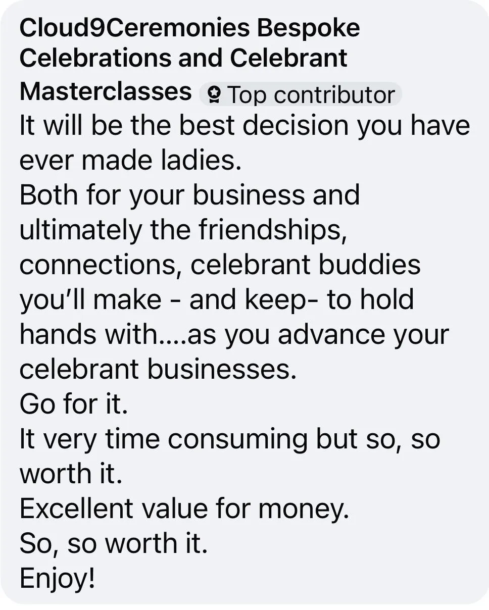 The course gave me the structure and tools to market myself on social media, create professional flyers, and most importantly, the belief to proudly say “I am a celebrant.” The coaching calls and community support were invaluable, turning nerves into confidence and helping me find real momentum in my business.