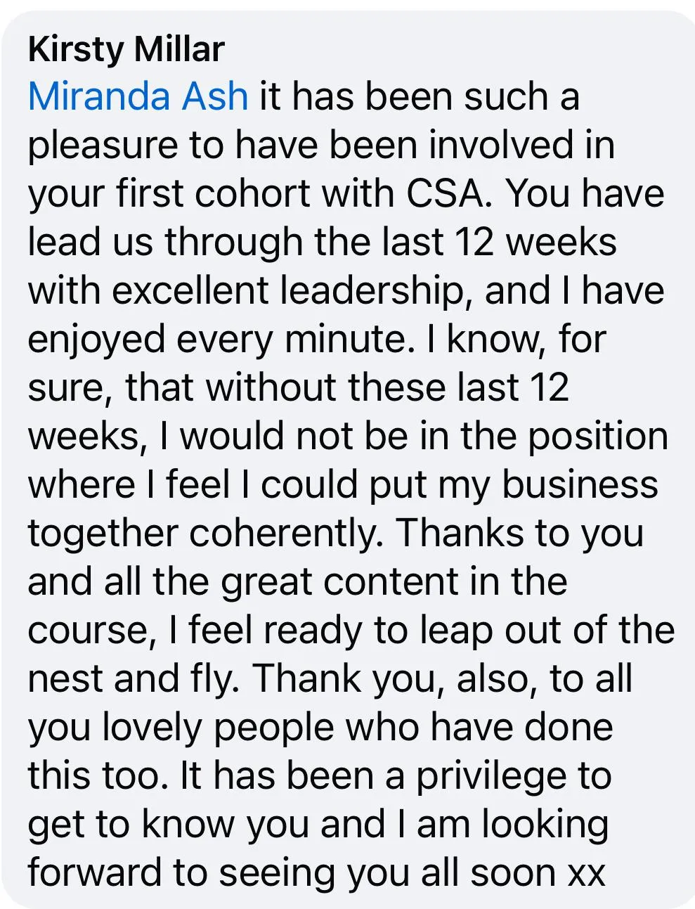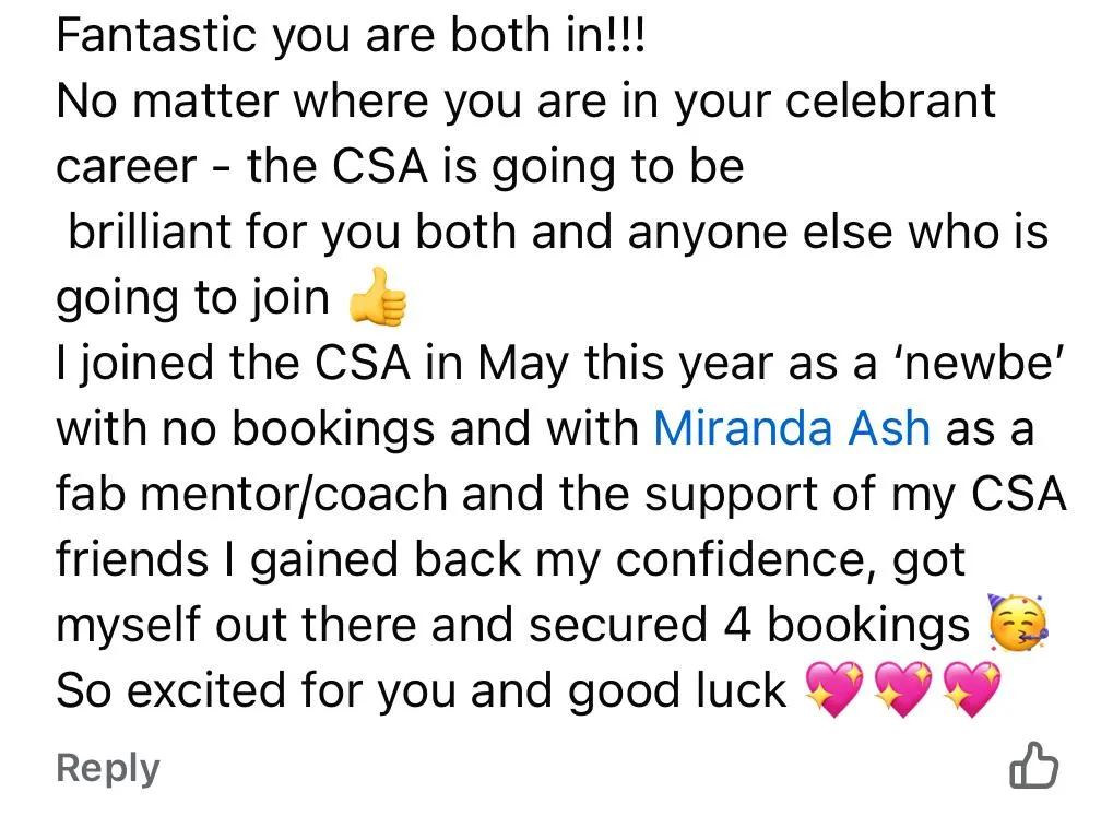 When I joined CSA, I had only one family booking and was struggling with confidence and direction. Over twelve weeks, everything changed, I picked up three confirmed, paid bookings, delivered my first naming ceremony, and built connections with venues who added me to their supplier lists.