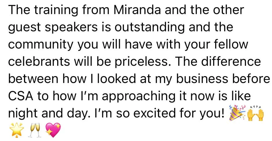 But when it came to growing her own celebrant business, Miranda knew she needed more than just passion. The Celebrant Success Accelerator was a game-changer, teaching her how to carve out her niche, create and execute a robust marketing plan, and ultimately build a thriving business. These are the very same strategies she now shares with fellow celebrants, helping them scale with confidence and success. It is absolutely worth the investment!